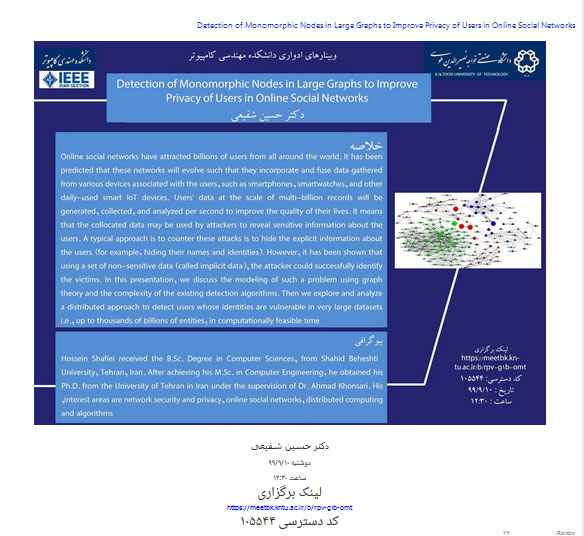 وبینار دکتر حسین شفیعی با موضوع: 'Detection of Monomorphic Nodes in Large Graphs to Improve Privacy of Users in Online Social Networks' زمان: دوشنبه 10 آذر ماه 99، ساعت 12:30 لینک ورود به جلسه: https://meetbk.kntu.ac.ir/b/rpv-g%DB%B1b-omt کد دسترسی:105544