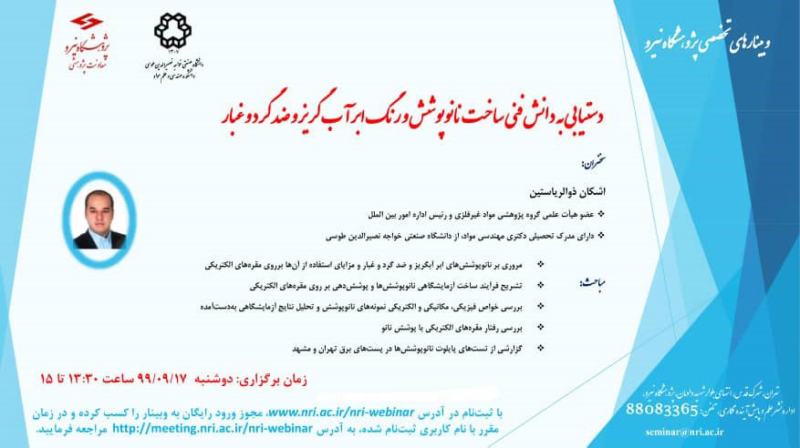 سخنرانی مجازی دکتر اشکان ذوالریاستین از پژوهشگاه نیرو با موضوع" نانوپوشش سیلیکونی برای تجهیزات عایقی فشار قوی" زمان: 17/9/99 ساعت 13:30
