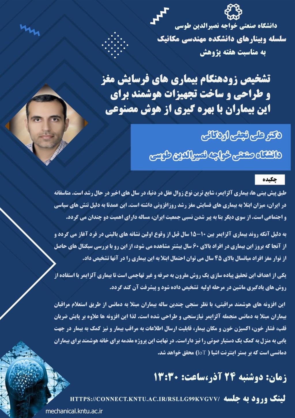 وبینار با موضوع: " تشخیص زودهنگام بیماری‌های فرسایش مغز و طراحی و ساخت تجهیزات هوشمند برای این بیماران با بهره‌گیری از هوش مصنوعی"