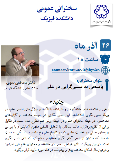 چهارمین جلسه از سری وبینارهای عمومی دانشکده‌ی فیزیک  با موضوع "پاسخی به نسبی‌گرایی علمی" برگزار می‌شود.